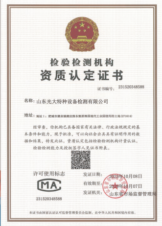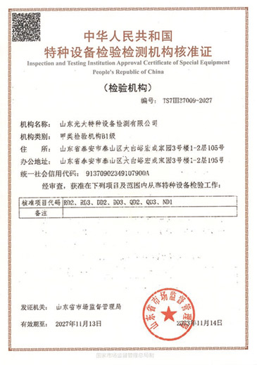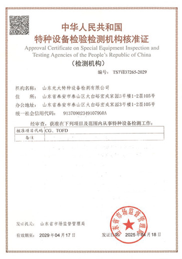 山東光大特種設(shè)備檢測有限公司是經(jīng)山東省市場監(jiān)督管理局核準(zhǔn)的甲類B1特種設(shè)備綜合檢驗機構(gòu)。2017年9月30日取得了山東省市場監(jiān)督管理局頒發(fā)的《檢驗檢測機構(gòu)資質(zhì)認(rèn)定證書》。2018年2月22日取得了山東省市場監(jiān)督管理局頒發(fā)的《特種設(shè)備檢驗檢測機構(gòu)核準(zhǔn)證》(起重機械)檢驗檢測資質(zhì)。2021年11月取得山東省市場監(jiān)督管理局版發(fā)的《特種設(shè)備檢驗檢測機構(gòu)核準(zhǔn)證》(安全閥在線、離線)校驗資質(zhì)。2023年11月取得山東省市場監(jiān)督管理局頒發(fā)的甲類檢驗機構(gòu)B1《特種設(shè)備檢驗檢測機構(gòu)核準(zhǔn)證》,具有壓力容器(RD2...